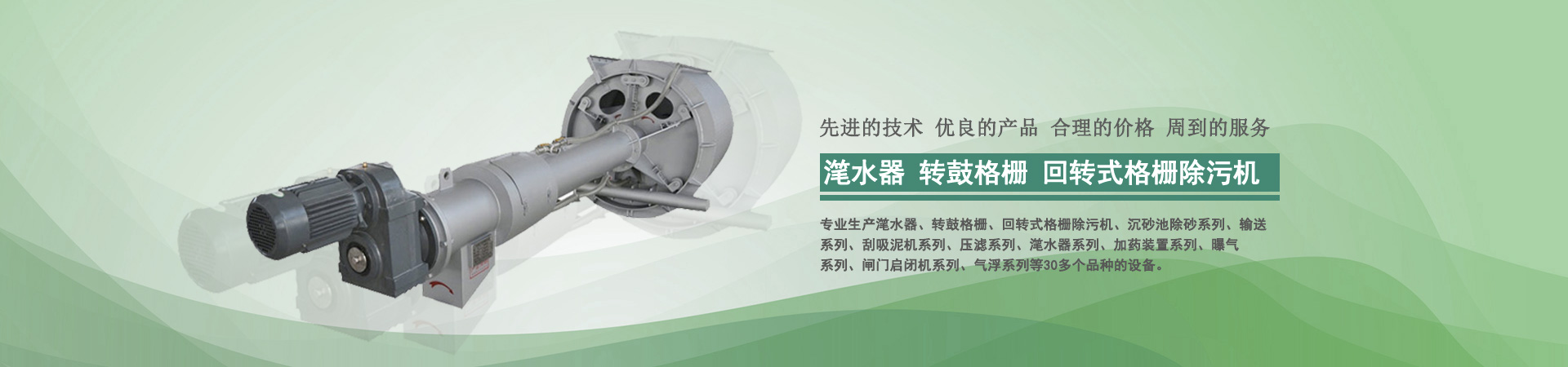 本公司目前專業(yè)生產(chǎn)轉(zhuǎn)鼓式精密過(guò)濾器、轉(zhuǎn)鼓格柵、回轉(zhuǎn)式格柵除污機(jī)、沉砂池除砂系列、輸送系列、刮吸泥機(jī)系列、壓濾系列、潷水器系列、加藥裝置系列、曝氣系列、閘門啟閉機(jī)系列、氣浮系列、曝氣器系列、填料系列等30多個(gè)品種的設(shè)備...